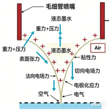 (示意图说明:展示毛细管喷嘴、液体墨水、电场分布及射流形成过程,标注重力 + 压力、表面张力、电场力等关键作用力)